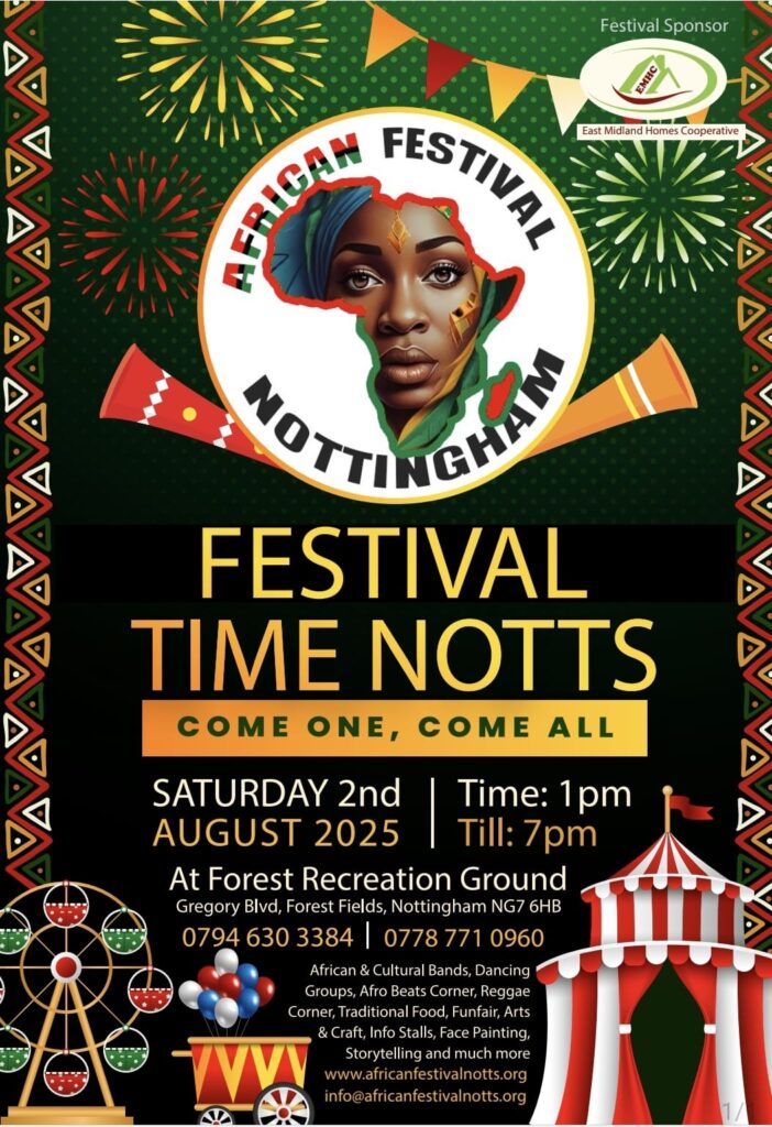 You’re cordially invited to attend the African Family Festival, an inaugural annual multinational and multi-ethnic celebration of African continent’s music and dance which will be held on AUGUST 2nd 2024, at the Forest Recreation Ground along the Gregory Boulevard, Forest Fields Nottingham, NG7 6HB from 1:00pm to 7:00pm.